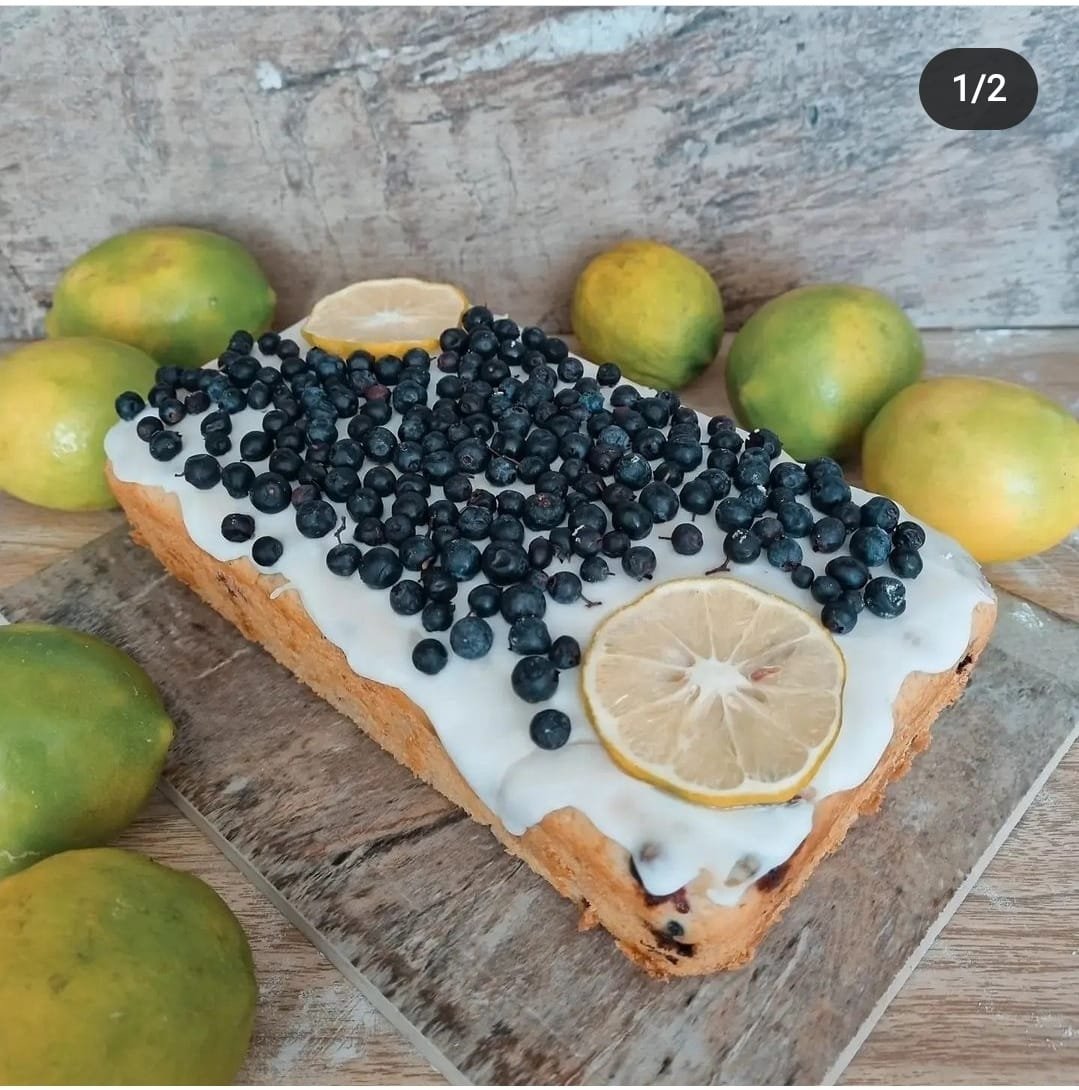 Masa de suave bizcocho aromatizada con limón, vainilla y mortiños, y en la cobertura glaseado de limón, mortiños y limón deshidratado.